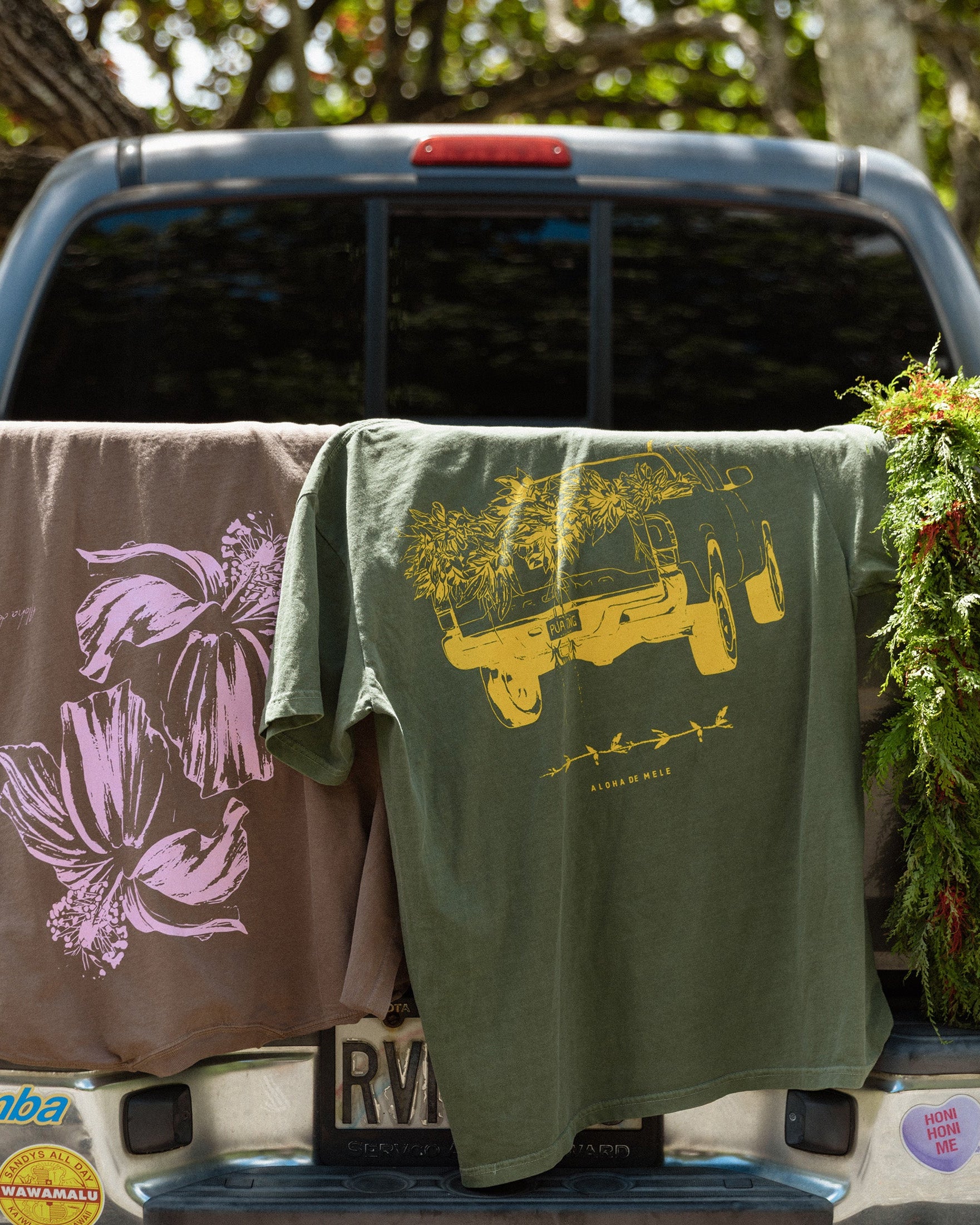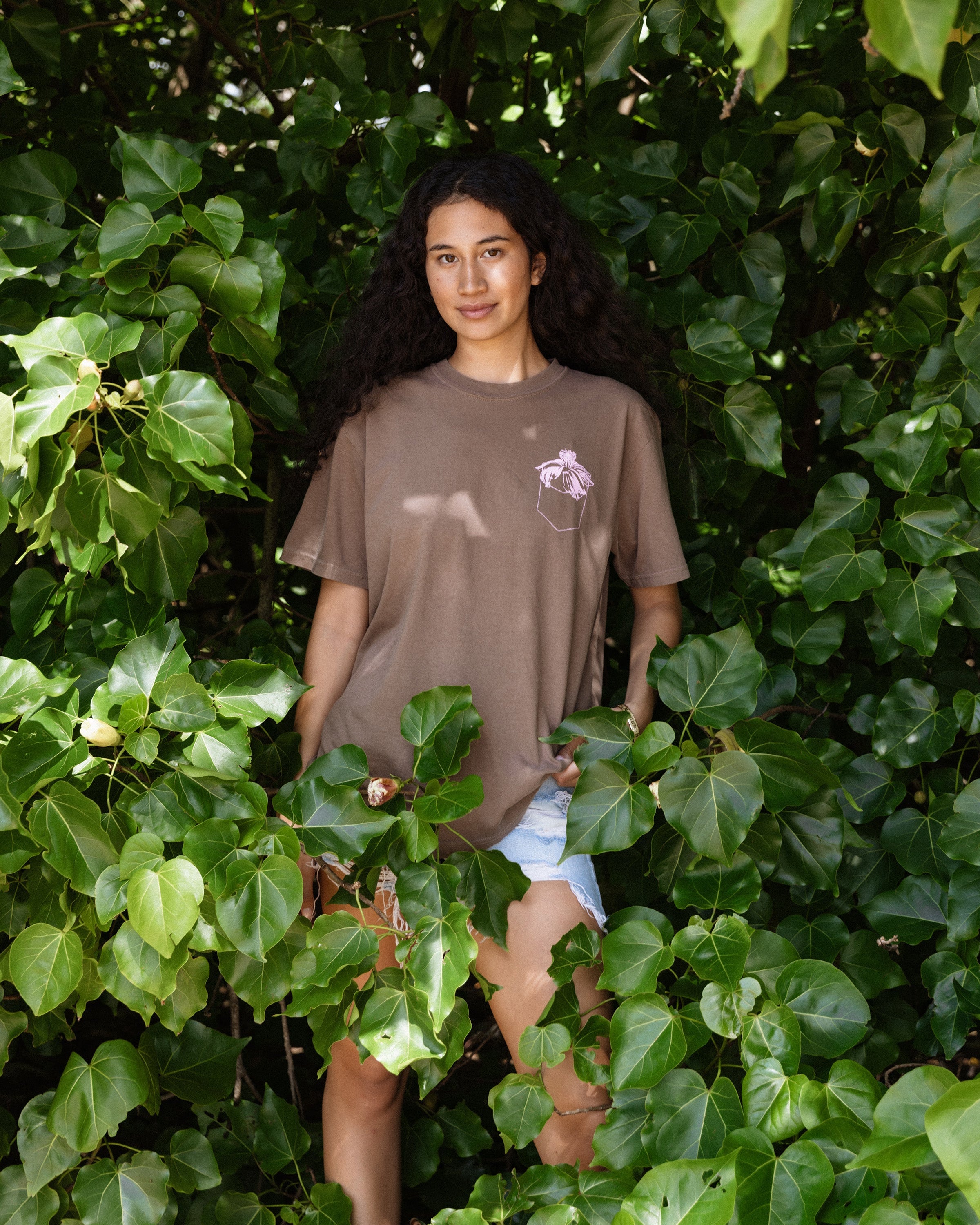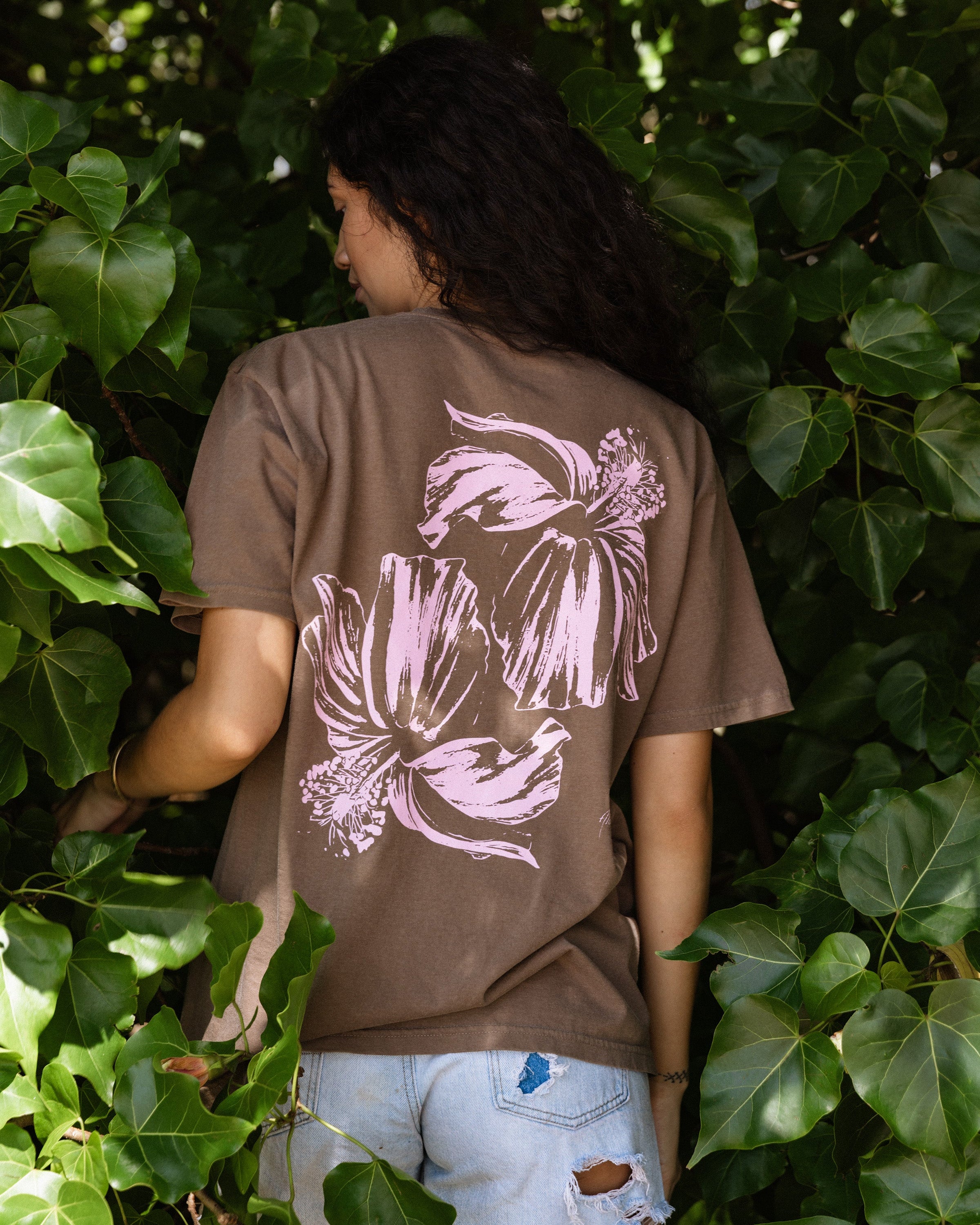 From the "Après Merrie 2026" Collection. This special edition shirt features a screen print of Aloha de Mele's double Koki'o Logo artwork in pink on a brown colored 100% cotton knit shirt.